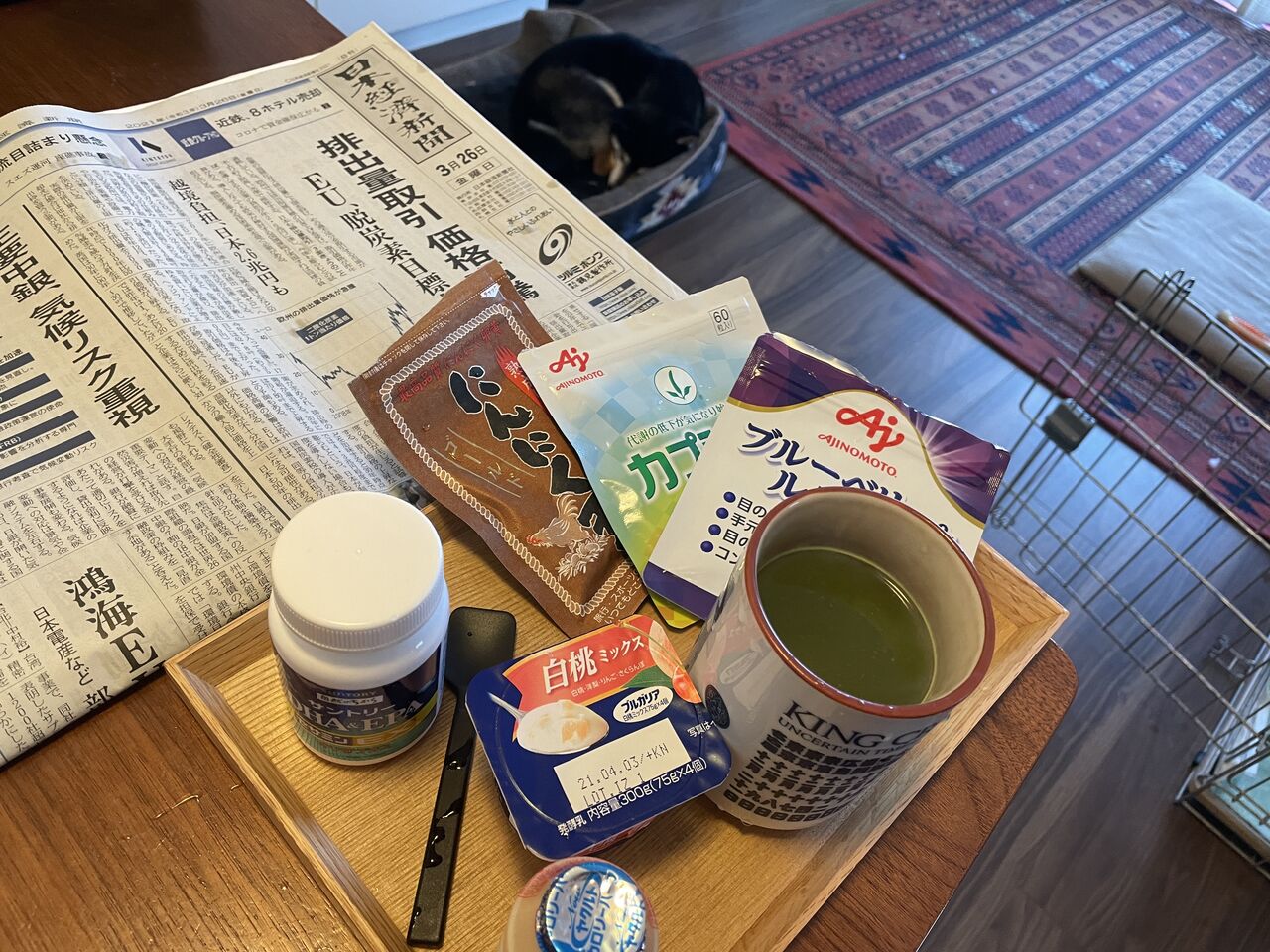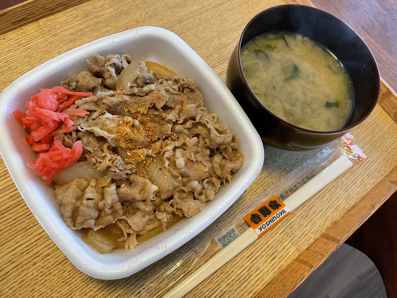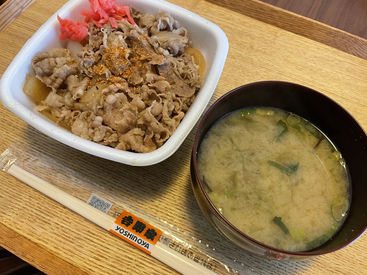 曇天のプレミアム牛丼とナス味噌炒めとスエズ運河