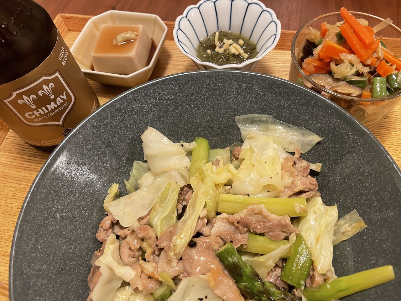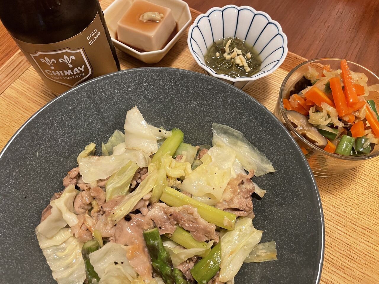 豚肉とアスパラのチーズ炒めを食す。