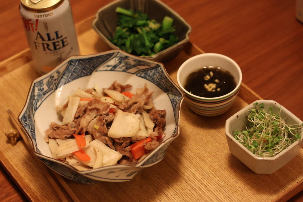 じゃがいもとピーマン、わかめの和物などを食す。