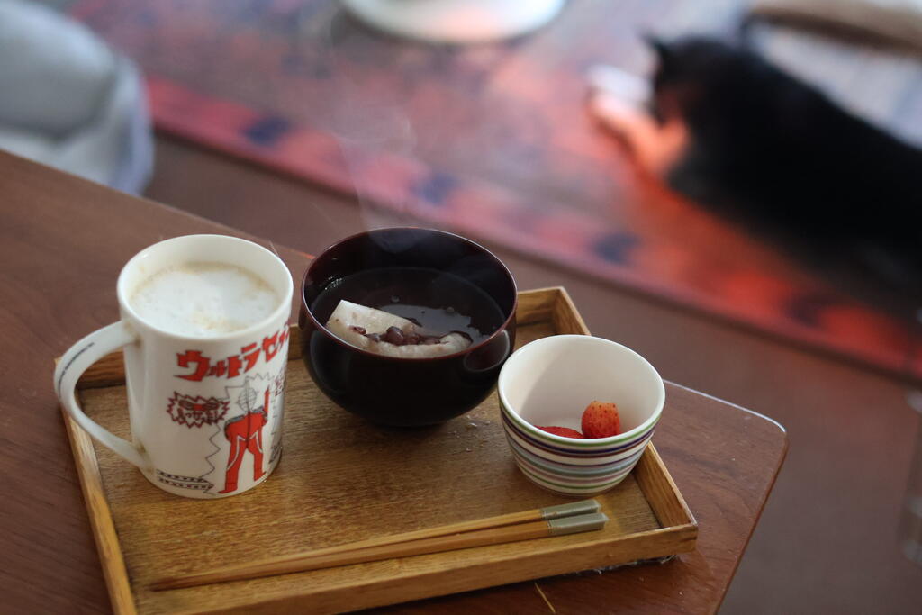 カフェラテ&餅なしのお汁粉。