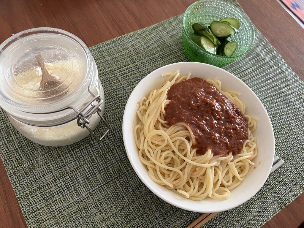 連暑のボロネーゼパスタとナスポークとパリ五輪