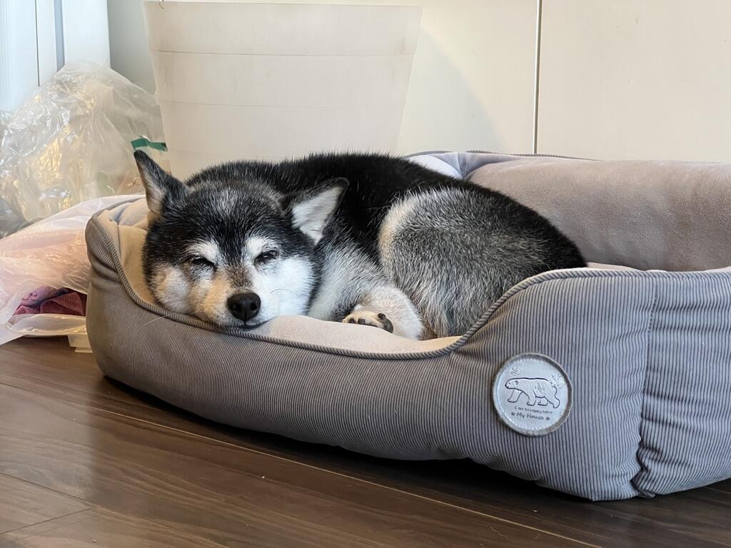 夜はお気に入りのペットベッドと