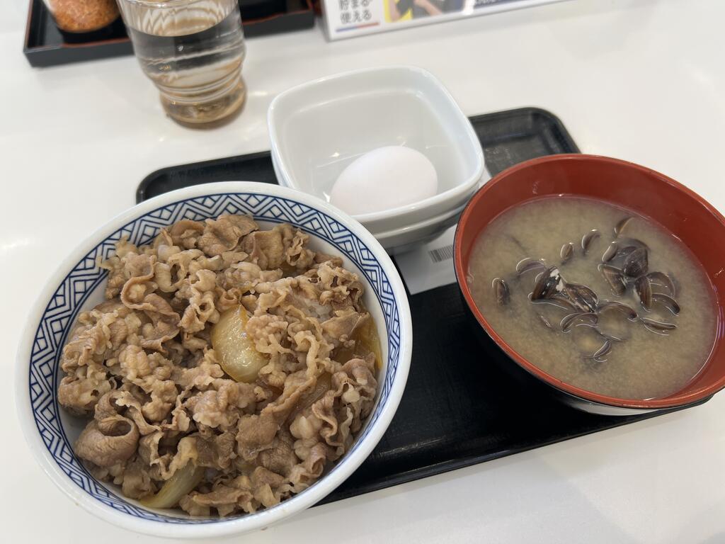 牛丼の並と卵としじみの味噌汁で腹ごしらえ。
