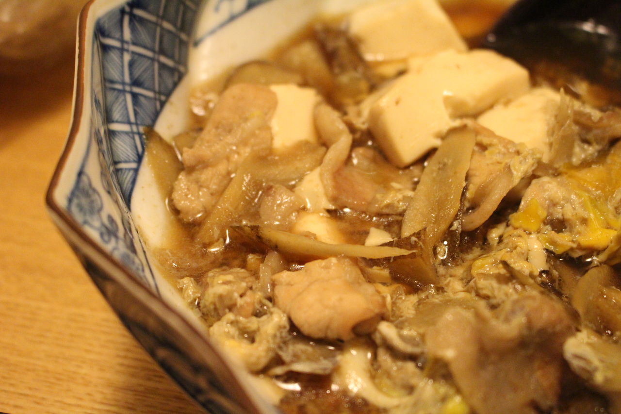 ごぼうと豚肉と豆腐の柳川風料理を食す。