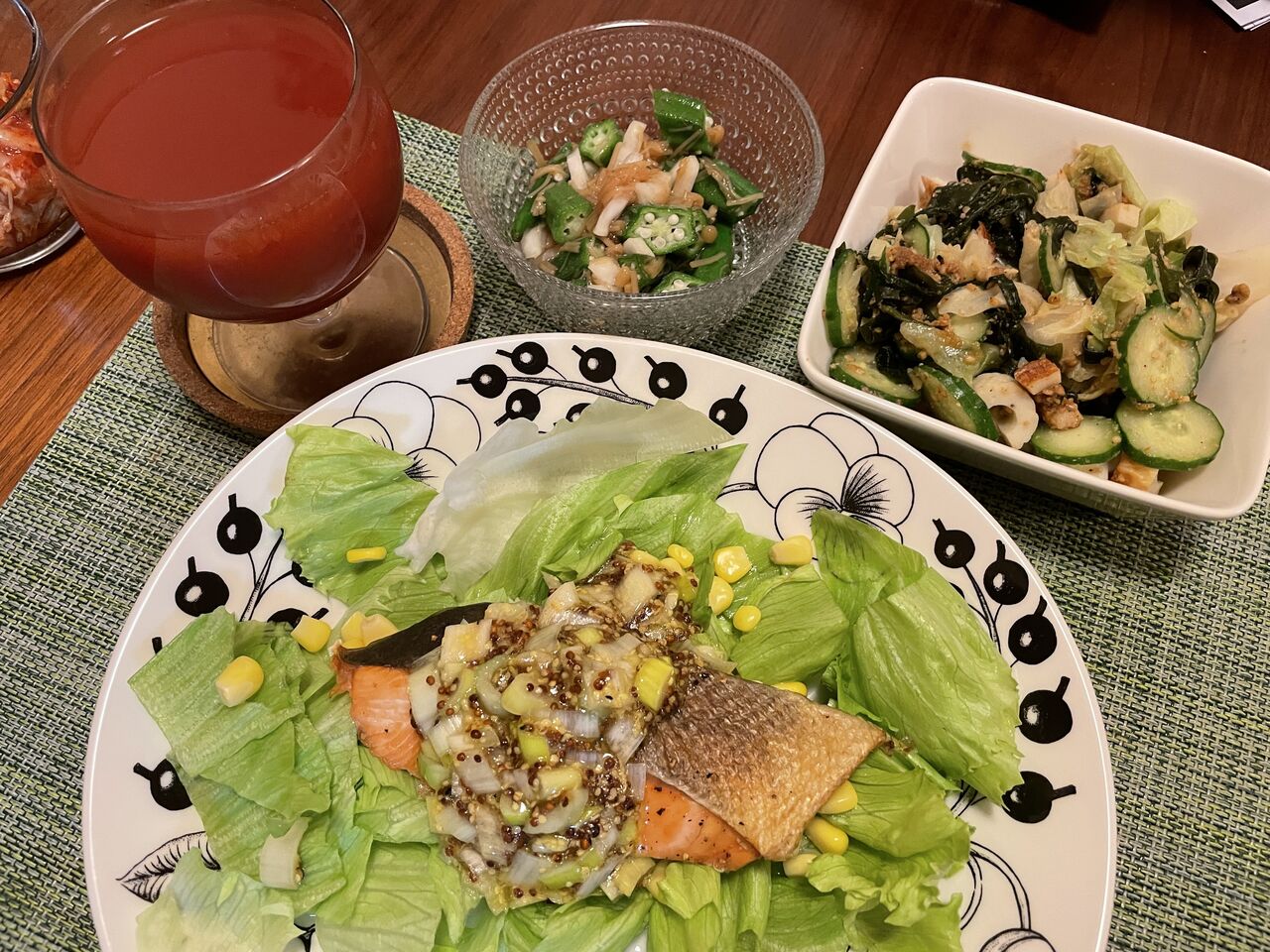 ブロッコリーとスナップエンドウのサラダなどを食す。