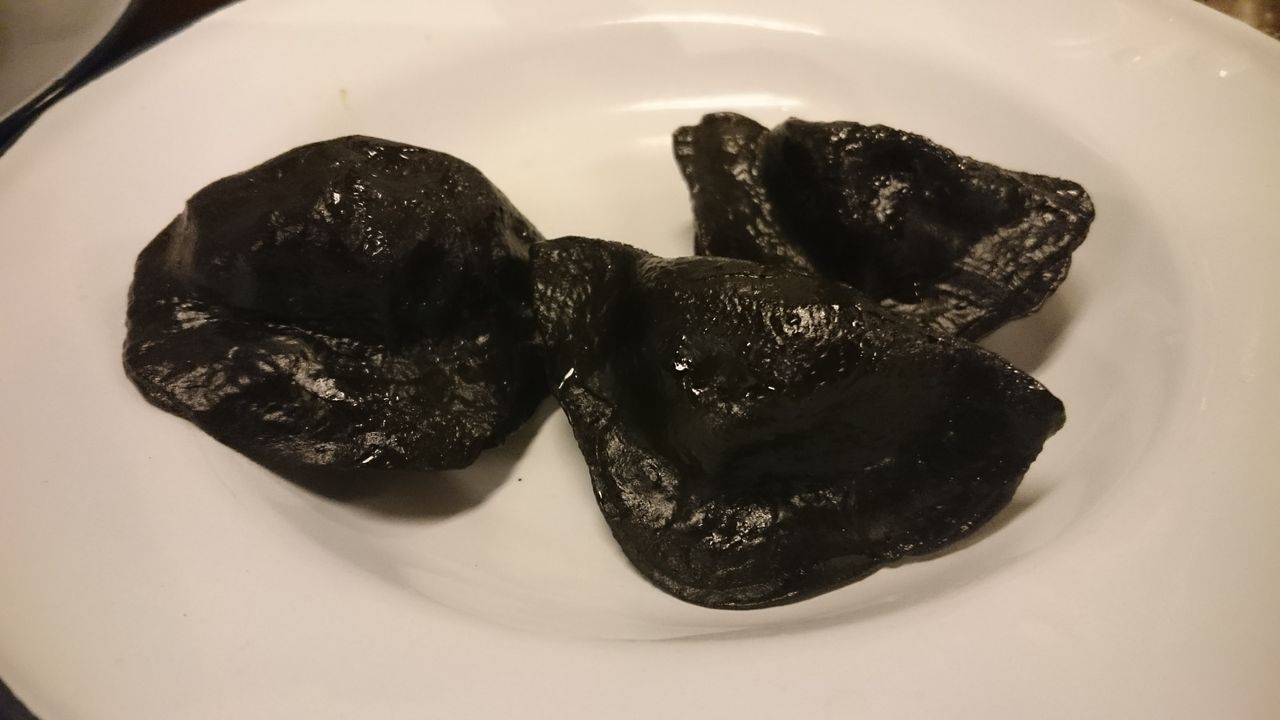 イカスミで黒い、イカと豚肉の餃子をシェアする。