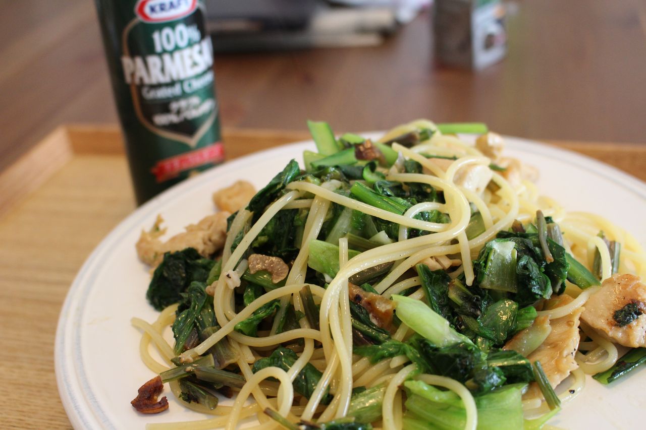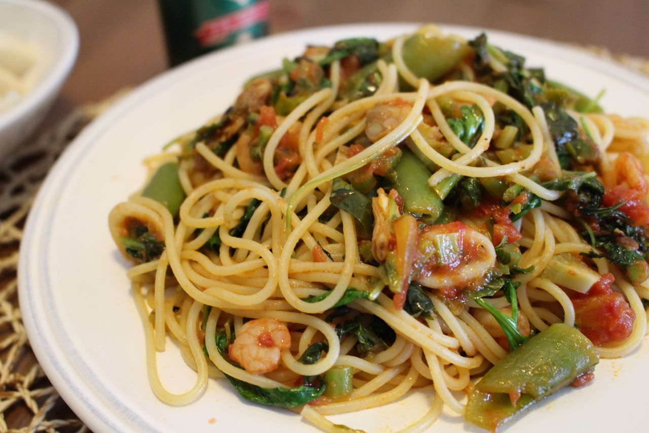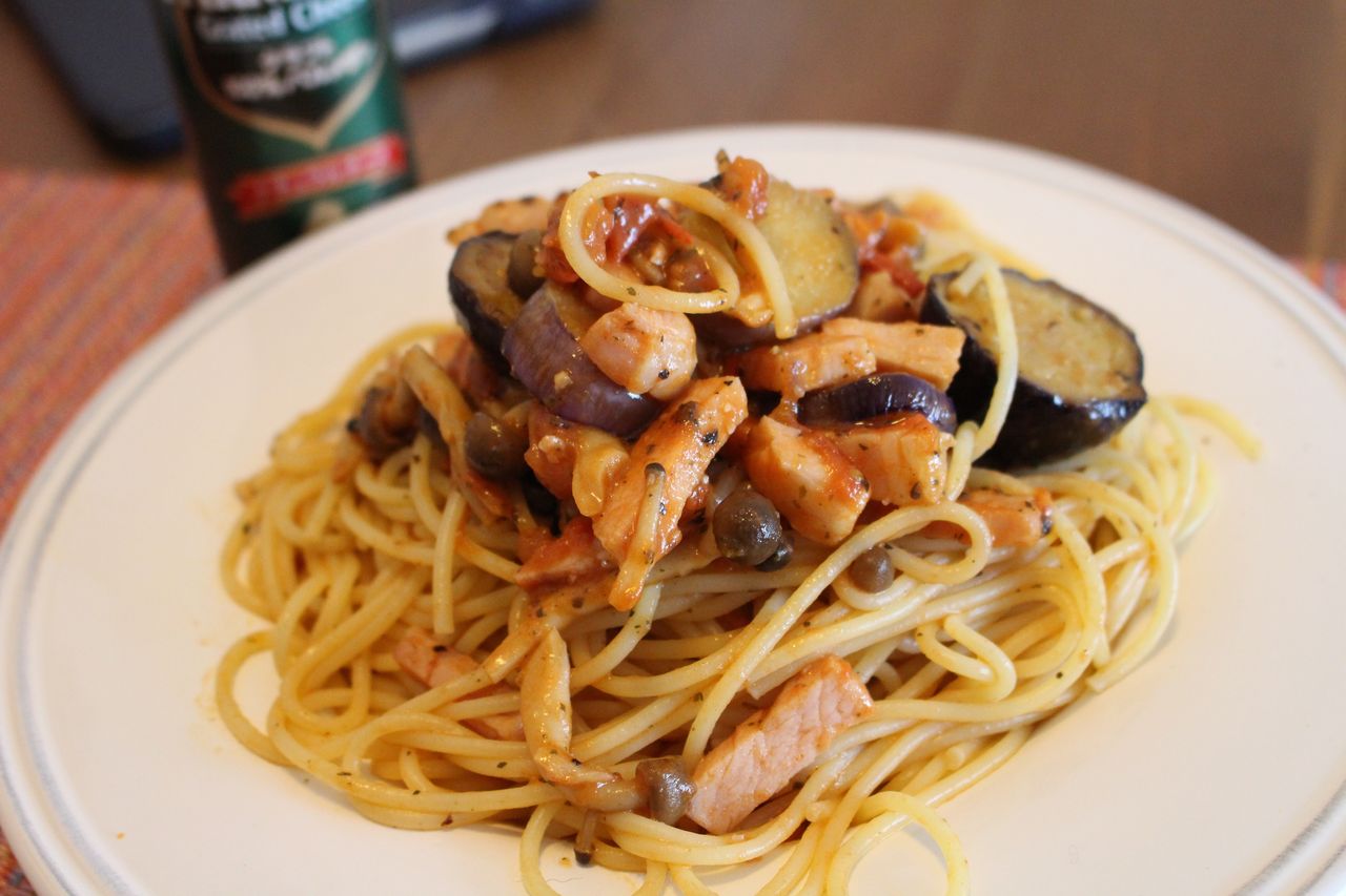 ロースハムとトマトと茄子とキノコのシンプルパスタ。