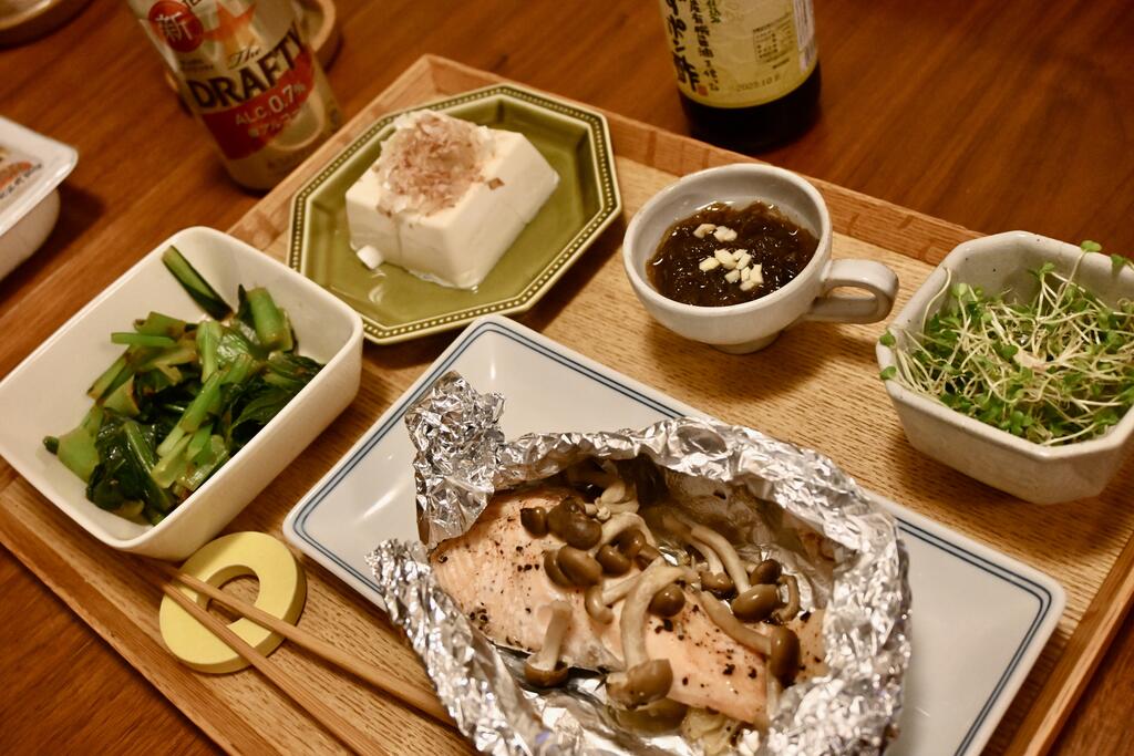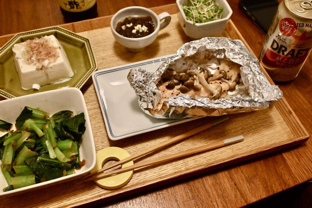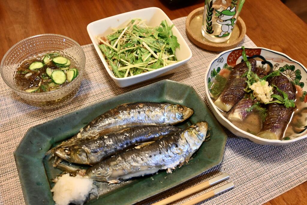 鰯塩焼き、ナスの煮浸しなどを食す。