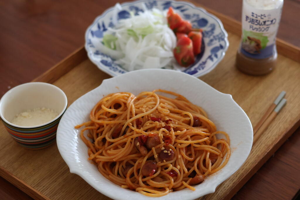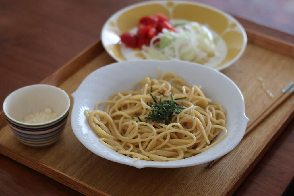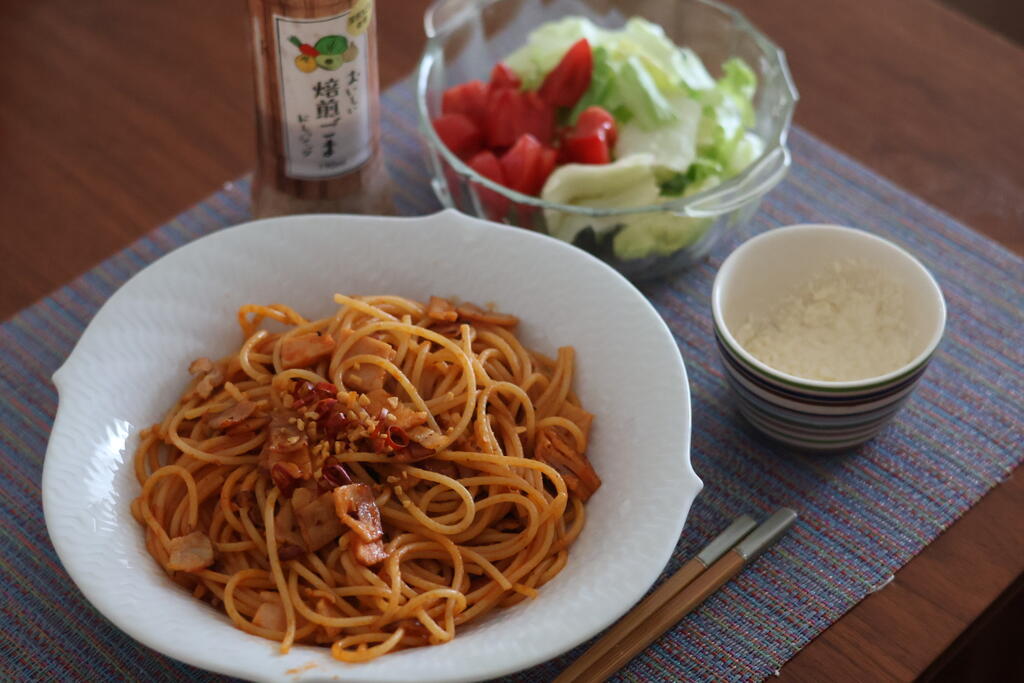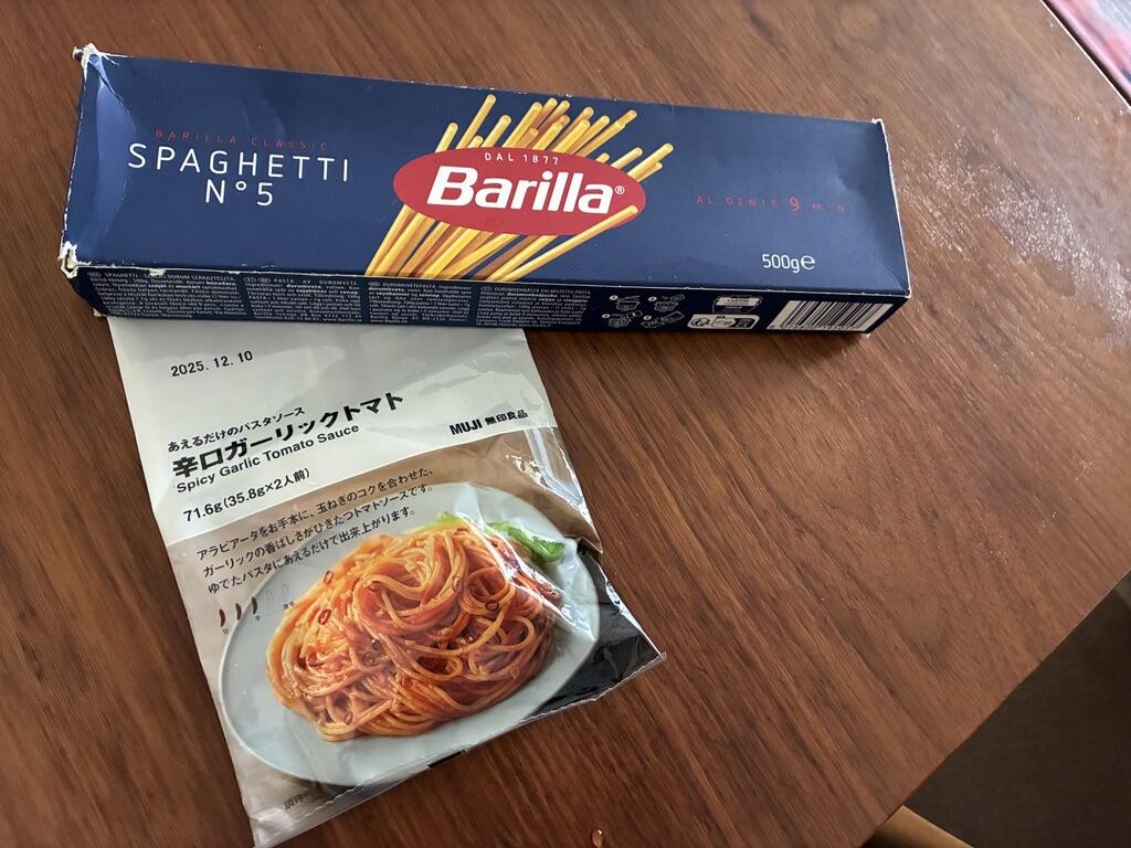 ランチはレトルトパスタ。